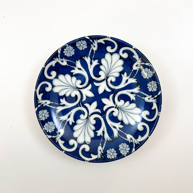 The design is both bold and refined, ornamental yet perfectly balanced, bringing a sense of movement and sophistication to the table. The contrast between the intense blue and the delicate white details creates a striking visual impact, making each piece a statement on its own.